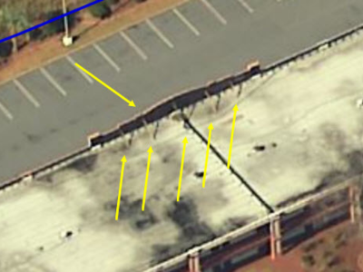 As evidenced by aerial imagery (courtesy of Pictometry), the parapet walls at the property had a long and storied history. In January 2003, no parapet walls were present. By February 2005, they had been added, and a number of braces had been placed behind them.