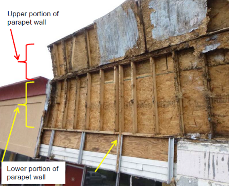 • Dangerous conditions were incidentally observed at the parapet walls along the front elevation, in conjunction with an unrelated investigation related to reported roof damage