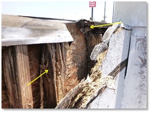 During this roof investigation, it could be seen that interior-grade materials had been used for the exterior finishes and that significant levels of damage were already present at this relatively recent wall installation. The blue tarp (visible in the October 2016 aerial imagery above), as well as withdrawn fasteners, could be seen within a significant gap in the exterior finish of a beam below the wall.
