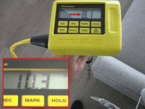 Measuring Over Deflection: Usually, significant deflection is not directly visible in a specifically desirable fashion; therefore, relative-elevation measurement can be used to find the derived difference between a perimeter benchmark and interior points, providing an assessment of the flooring topside surface profile.