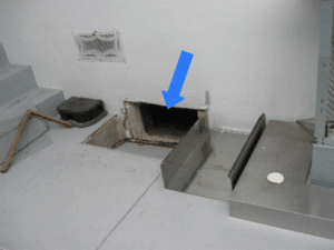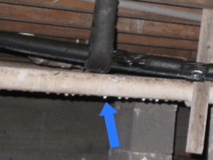 Drainage Too Close to Building: Contemporary codes require that drainage water – whether from rain, runoff or condensate – be deposited at least one foot away from the building, communicated (directed) away from the building and not allowed to impound up (pool) against the elevations. Allowing moisture to form, collect and accumulate within the crawlspace creates conditions for an imminent problem. Water entry into the crawlspace, including condensate from routed AC, refrigerant lines or plumbing, as well as leaks from water or waste lines that may introduce water into the crawlspace must be immediately addressed to prevent pervasive wood rot of the floor support.