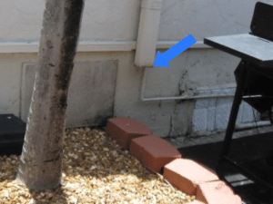 - Downspout discharge too close to building, so drainage is not diverted from elevation